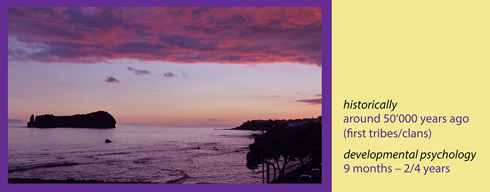 Children at this age are full of love and full of hope as well as completely without prejudices and live in their own world, which has magical features for their stuffed cuddly toy is alive. They believe in fairy tales and miracles, which allows them to transform into whatever they wish. Their existence is characterised by strong feelings: desire for existence and despair of existence are sometimes only a hair's breadth apart and can change in a matter of seconds. Lack or punishment trigger intense frustration. A loving look, a smile or a game cause great joy. They are masters of exploration and seized by the moment. For all their steps out into the new, unknown world, they need a safe haven of retreat: to feel safe in their family, group or tribe. This security and connection experienced in early childhood form the basis for confidence in life.